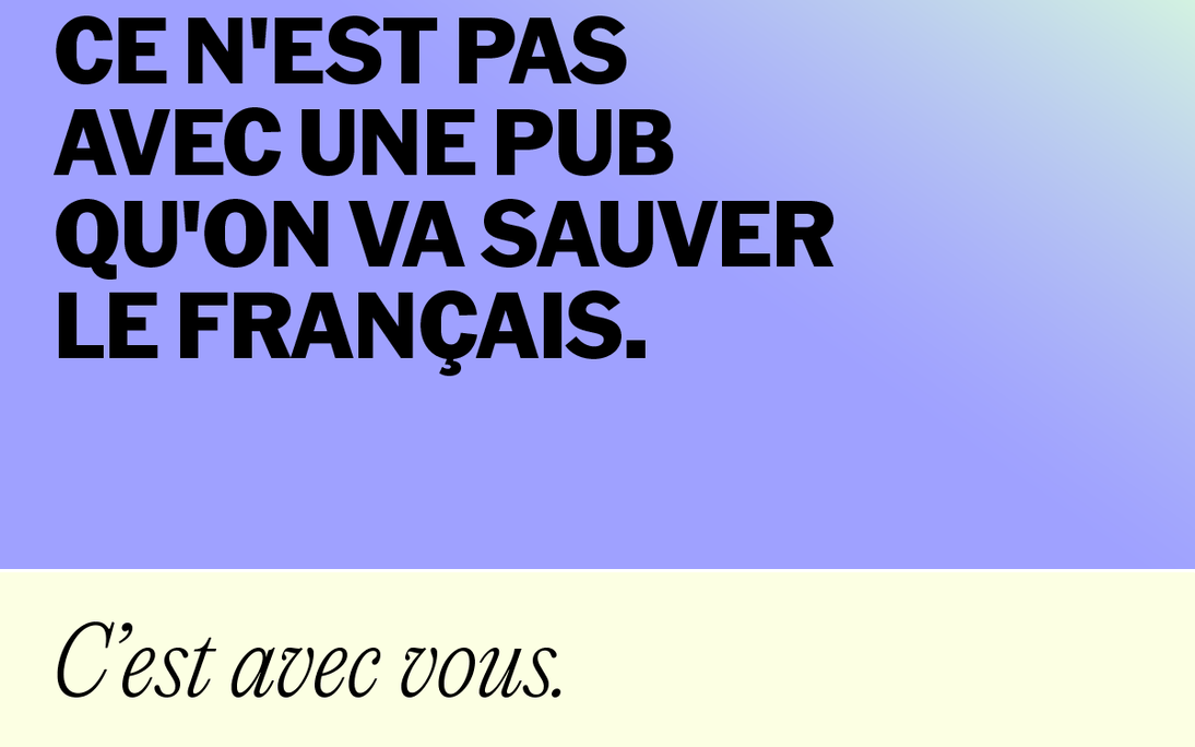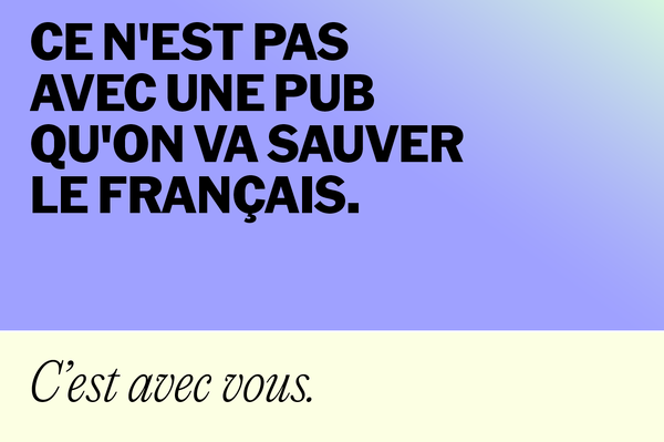 Le ministère de la Langue française est fier de vous présenter sa nouvelle campagne de promotion et de valorisation de la langue française, que vous pourrez voir dans divers médias en mars 2026. Visant à créer un effet d’entraînement positif pour que la population québécoise pose des gestes pour assurer la vitalité de la langue, elle se déclinera en outils pour la télévision, la radio, la presse et les médias sociaux ainsi qu’en divers affichages personnalisés dans des villes comme Montréal, Laval, Longueuil, Gatineau et Brossard.